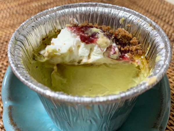 ピスタチオグリーンがあまりに美しく断面を撮影。ブリュレ部分がとてもおいしく、ベリー系の酸味がアクセントになっています。ピスタチオは甘すぎず苦みを少し感じるくらい濃厚な味わいでピスタチオ好きのわたしも大満足!