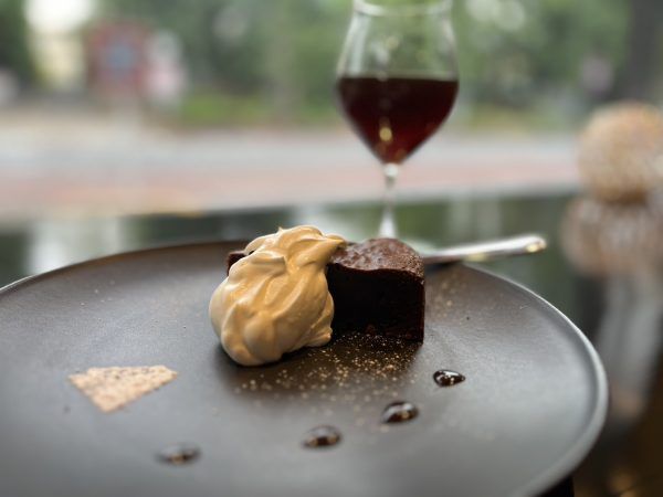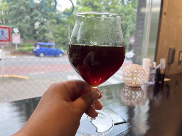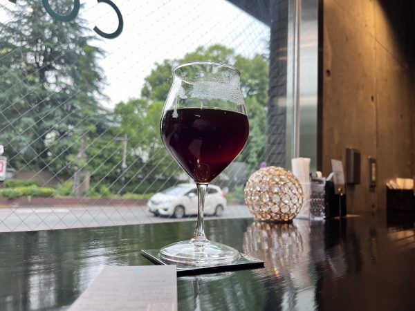 その生ガトーショコラと相性の良いコーヒーを教えて頂き、その中から今回はエルサルバドルをホットでお願いすることにしました。するとなんとワイングラスのようなグラスに入ってコーヒーが登場!