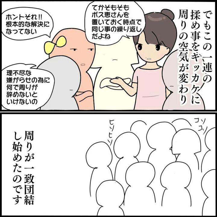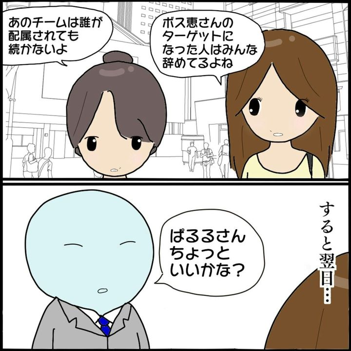 気に食わない相手を次々とイジメて退職に追いやってきたお局職員の「ボス恵」さん。同じチームに配属されてしまったぱるるさんはさっそく目を付けられ、あからさまな嫌味や陰口、仲間はずれにあってしまいます。