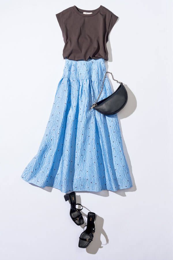 クールなグレーTも水色スカートなら清涼感たっぷり! チャコールグレーのTシャ ツでおしゃれ上級者感。ボトムで色を足すなら清楚なライ トブルーが辛口になりすぎずフェミニン派におすすめ!