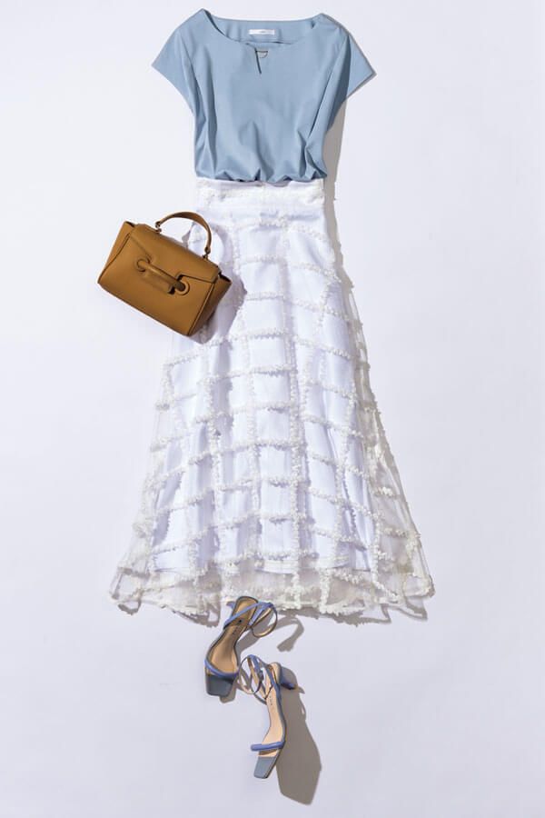 チェックが浮き立つシアースカートで Tシャツをドレスアップ。ライトブルー×透けホワイトの夏らしいコーディネート。Tシャツは胸元にゴールドパーツを配したきちんと感のあるデザインなので、お仕事シーンにもうってつけ。