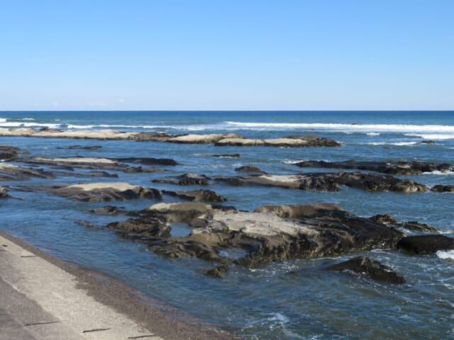 波打ち際に降りれば、黒い岩礁にはじける波を見ながら磯遊びをすることができます。ごつごつとした岩場では、砂浜とは違った自然の雰囲気があります。