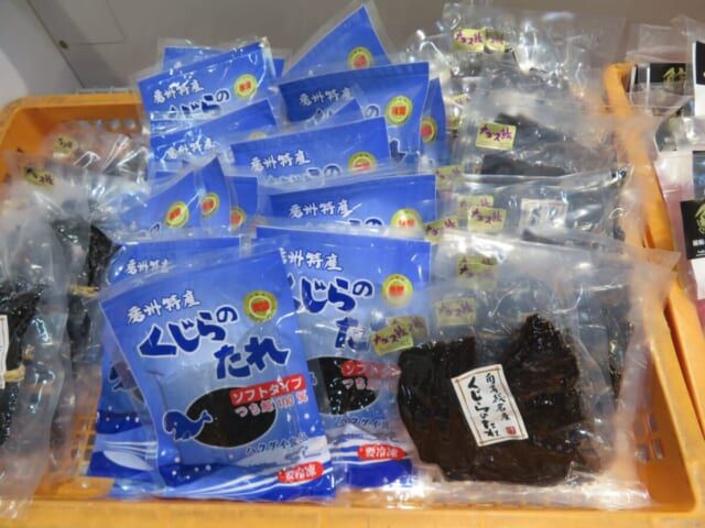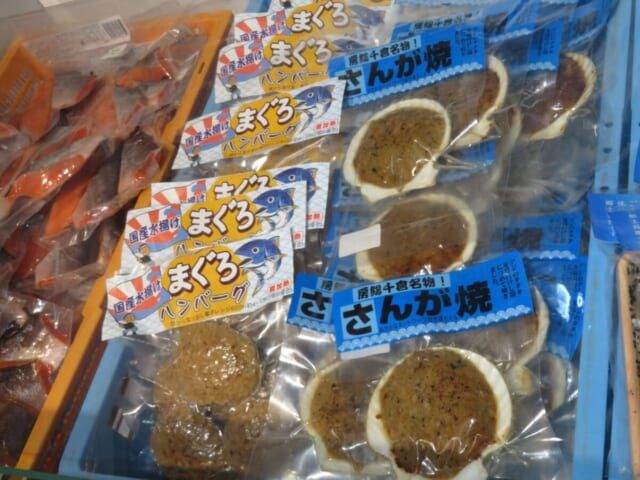 いけすを囲む売店では新鮮な魚介類の他にも、バラエティー豊富な加工食品も販売されています。房総半島の漁師に伝わる郷土料理「なめろう」を炙った「さんが焼」や、クジラ肉を加工した「くじらのたれ」などがそろいます。
