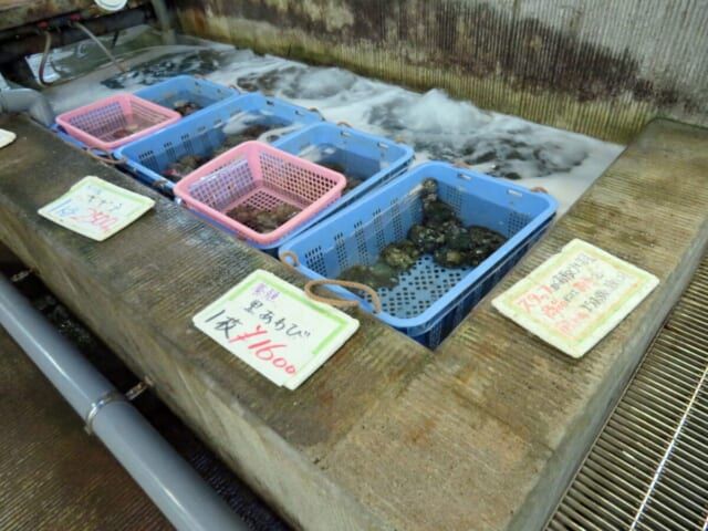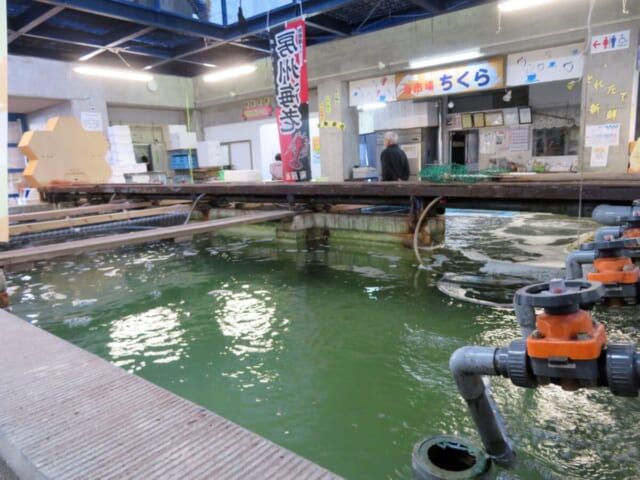 道の駅施設内には、新鮮な海の幸を購入できる魚市場もあります。中央の大きないけすにはピチピチの魚介類がたくさん。