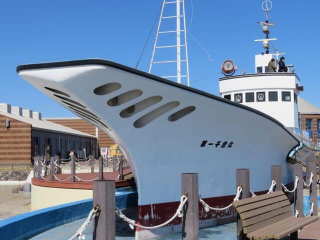 施設内に展示されている大きな漁船は第一千倉丸のレプリカ。南房総市の千倉沖では、サバやサンマの漁が盛んに行われてきました。1960年前後には100隻近くの漁船が沖合を行き交っていたのです。往時を偲ばせる70t級の漁船のレプリカに乗りこめば、漁師の気分を体感することができるはず。