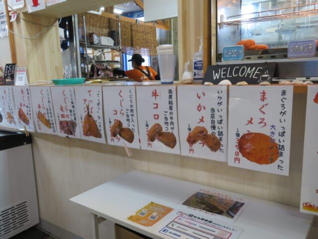 市場食堂の「せん政水産」で販売されているのが、海産物ベースのコロッケやミンチ、フライ。「まぐろメンチ」や「くじらコロッケ」などで味覚の世界を広げることができそうです。海岸線の散策やドライブのおともにも、うってつけです。