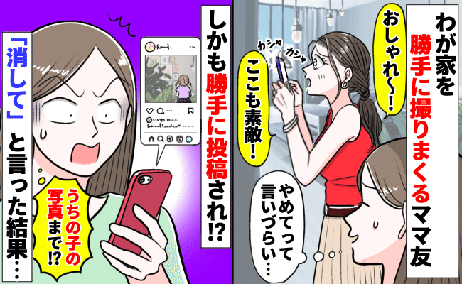ママ友を家に招いた数日後、なにげなくママ友のSNSを見ると、『この前ママ友の家に行ってきました〜♪ インテリアが素敵だったので、共有です♡』という文章と共に、わが家のインテリアが写った写真が大量にアップされていたのです……。掲載許可どころか、撮影許可も出していなかったので、ビックリしてしまいました。しかもわが子の後ろ姿までばっちりと写ってしまっている写真もあり、驚愕……。