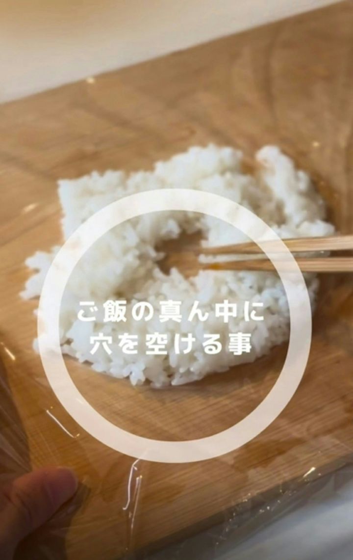 ドーナツに穴が空いているのは、火の通りを均一にするため。その理由と同じように、ご飯を冷凍する際に真ん中穴をあけておくことで、電子レンジ加熱時に中からも熱が入り、ムラなく温まって早く解凍できるとのことです。