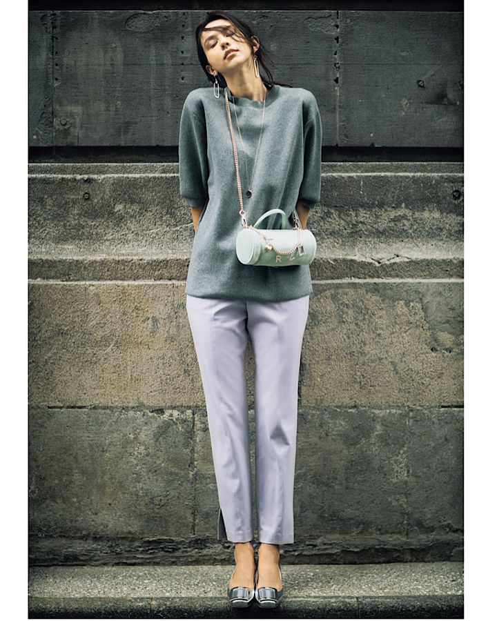 パンツ¥18,000(カデュネ)ニット¥54,000(アンスクリア/アマン)バッグ¥233,000パンプス¥103,000(ともにロジェ ヴィヴィエ/ロジェ ヴィヴィエ・ジャパン)ピアス¥15,120(パス コレクティブ/ZUTTOHOLIC)ネックレス¥46,000(ココシュニック)