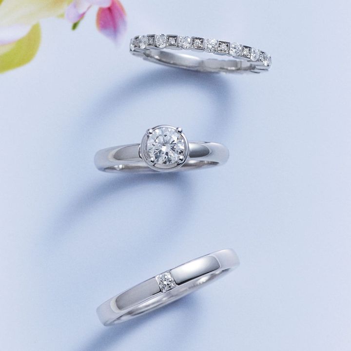 上から・リング「ブリッランテ ソリティア ラウンド ブリリアント」〈Pt×Dセンター0.3ct~〉¥622,600~「スティーレ」〈Pt×D〉¥174,900「スティーレ パヴェライン」〈Pt〉¥145,200(すべてTASAKI)