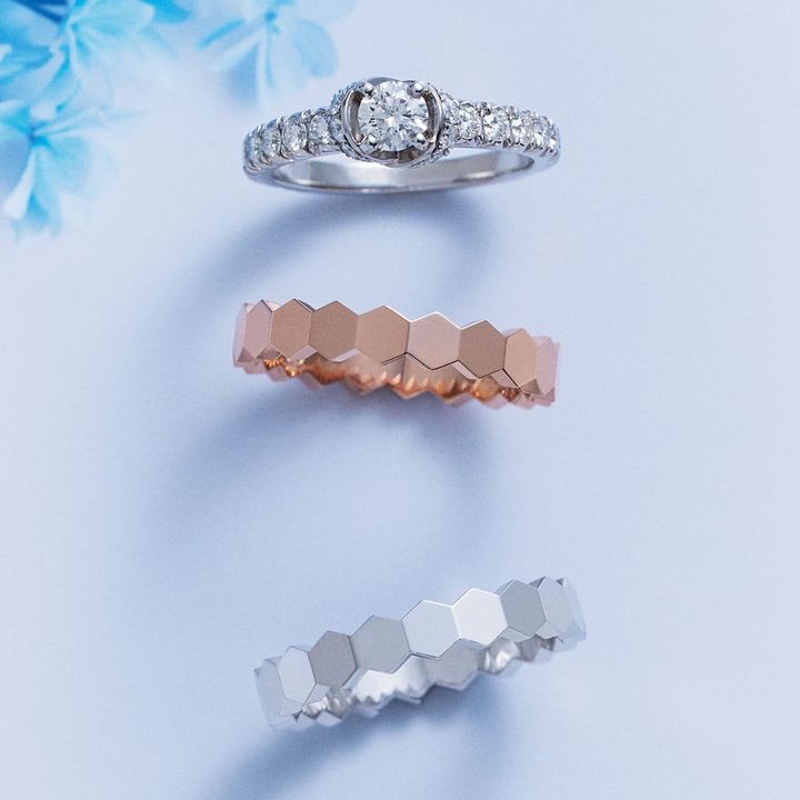 上から・リング「リアン」コレクション リアン ダムール ソリテールリング〈Pt×Dセンター0.3ct~〉¥692,000~予定価格「ビーマイ ラブ」コレクション ハニカムリング〈PG×D〉¥284,900〈WG×D〉¥299,200(すべてショーメ)