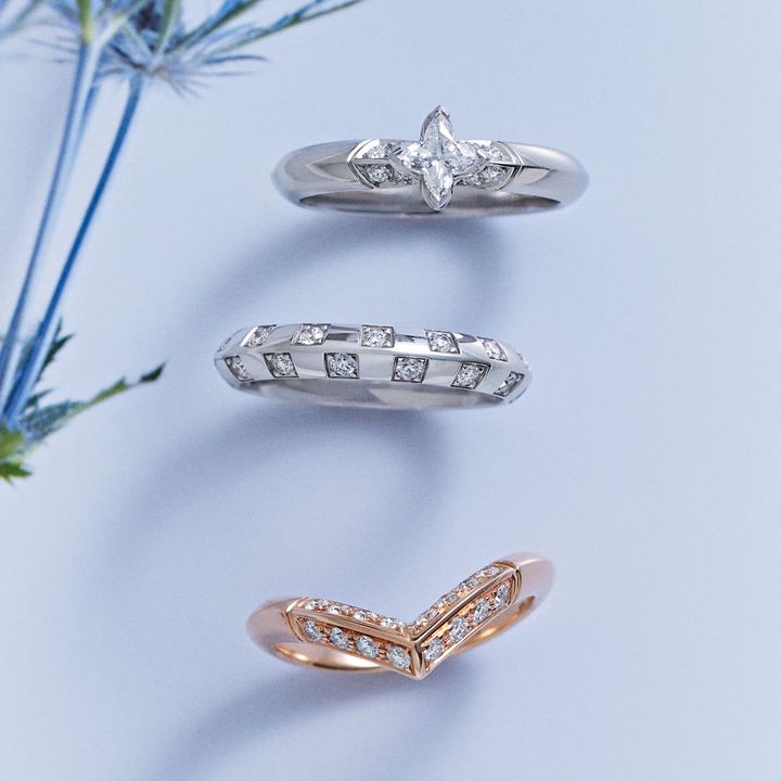 リング「LVダイヤモンド」上から・〈Pt×Dセンター0.3ct~〉¥583,000~〈WG×D〉¥764,500〈PG×D〉¥594,000(すべてルイ・ヴィトン/ルイ・ヴィトン クライアントサービス)