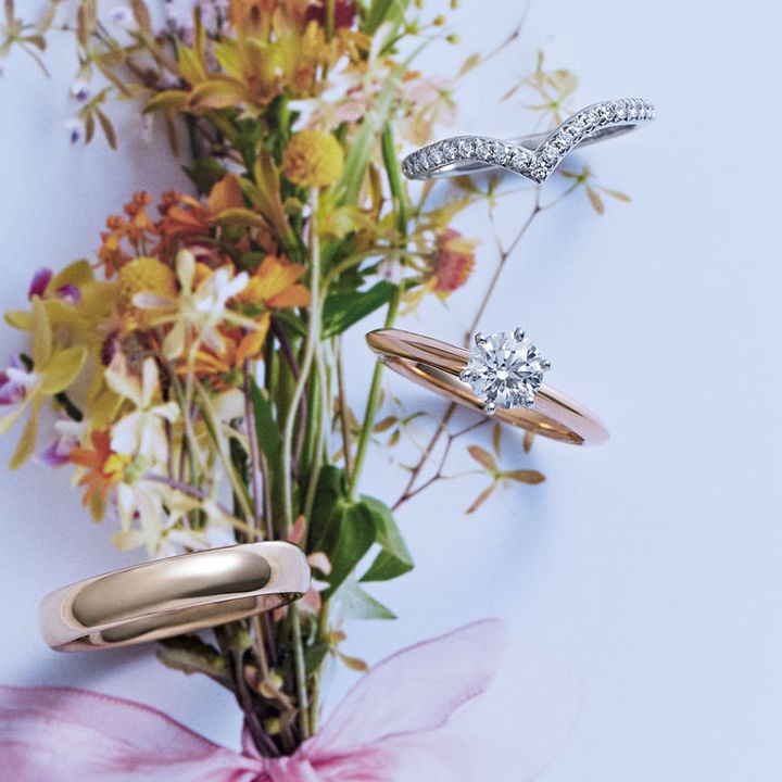 リング上から「ティファニーソレスト Vリング」〈Pt×D〉¥434,500「ティファニー®セッティング エンゲージメントリング」〈RG×Dセンター0.18ct~〉20万円台~「ティファニー フォーエバーウェディングバンド リング」〈YG〉¥169,400(すべてティファニー/ティファニー・アンド・カンパニー・ジャパン・インク)