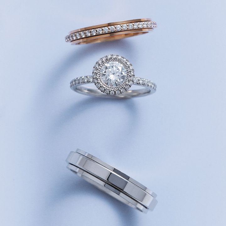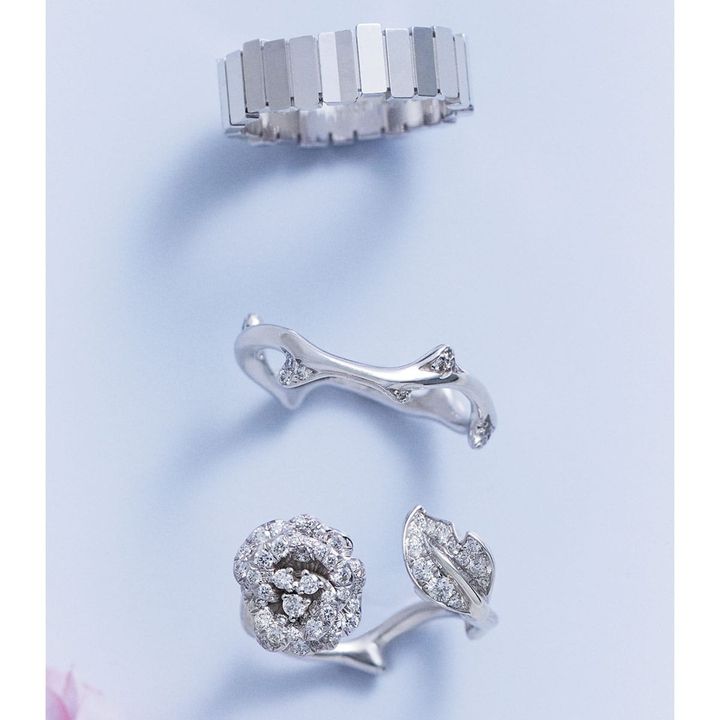 リング上から・「ポセション」〈PG×D〉¥602,800~「ピアジェ パッション」〈Pt×Dセンター0.7ct~〉¥968,000~「ポセション」〈WG〉¥268,400~(すべてピアジェ/ピアジェコンタクトセンター)