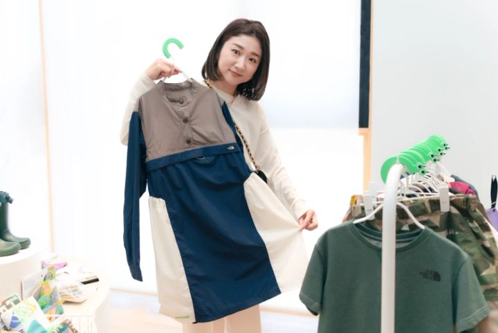 軽くてメッシュ素材が使われているTHE NOTH FACEの抱っこ紐(¥30,360)発見。約400gと軽量で、「パパやママの体への負担が軽くなりそうでいいし、見た目がおしゃれ!これならパパが率先して抱っこしてくれそう」と石川さん。そして、産休明けのママが開発したというマタニティレインコート(¥44,000)は、ママのレインコートとベビーポンチョがセットになっているという高機能なつくり! マタニティ時の大きなお腹もすっぽり入り、産後はベビーを抱っこしたまま使え、さらには、ベビーポンチョとしてセパレートできるところが秀逸。石川さん含め、取材メンバーも思わず拍手するほど汎用性の高いアイテムは必見です。