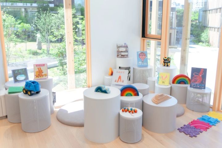 柔らかなクッション性のあるマットが敷かれたレストスペース。日当たりも良くて、ちょっとしたフォトスポットとしても人気なんだそう。ここは、ライブラリーコーナーにもなっていて、置かれている絵本にもこだわりが詰まっています。