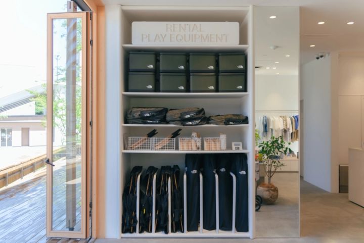 店内入り口から、パッと目を惹くのが明治公園内で使えるレンタルアイテムの棚。THE NORTH FACEのテーブルやチェア、シート、保冷バッグと、NEUTRALWORKSのスティック&スキットルズやフレスコボールなどの遊び道具がラインナップ。また、キッズには大人気のキックバイクもレンタルできるシステムが! 公園内の好きな場所に、テーブルやチェアを設置し、フードやドリンクを保冷バッグに入れて、家族やグループで青空のもと、寛ぎタイムを楽しめちゃうんです。石川さんも「シートやチェアを持ってくると大荷物になるから、これは便利!遊び道具まで借りられるのはいいですね」と感動した様子。