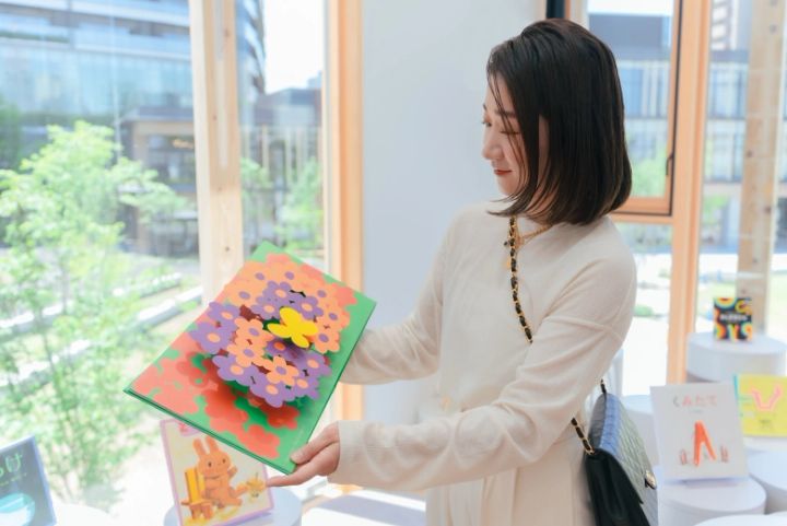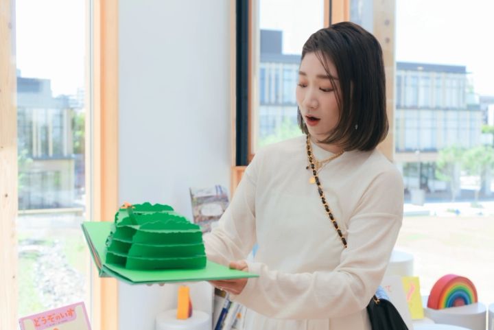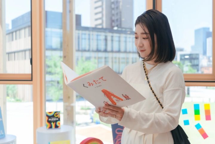「くみたて」の作家、田中達也さんが大好きという石川さん。「小学4年生の娘の教科書にも使われていて、羨ましいなーって子どもと話したんです。ここにある絵本、全部子どもに読んであげたいです」