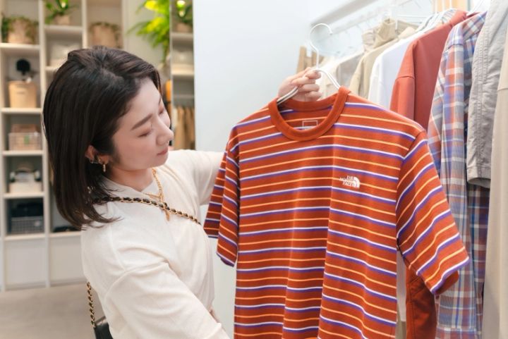 石川さんも「ジムでも使えそうだし普段着でも使えそうなアイテムが多いですね! メンズアイテムも柄物とかカラフルな色の物がたくさんあってパパにいいな」とじっくりチェックしていました。