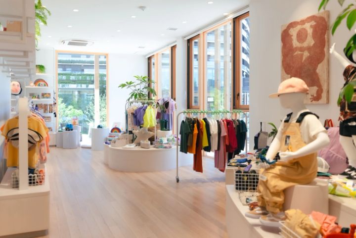 ウッディな内装と大きな窓から公園のグリーンが眺められて、清々しい空気が流れる2階フロア。ベビーから小学校高学年のキッズ向けのウェアを中心にしたラインナップは、ママの物欲もしっかり刺激する充実っぷり!