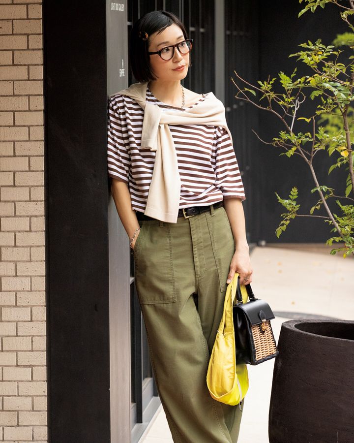 「ブラウンが今季らしいボーダーTにウォッシュドベイカーパンツを合わせて、ヴィンテージムードに仕上げました」