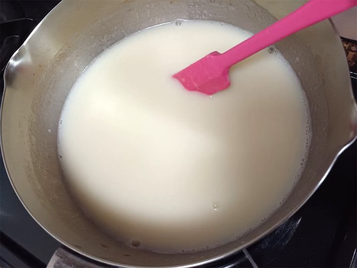 3.2が熱いうちに1のふやかしたゼラチン、砂糖、コンデンスミルクを加えて混ぜる。