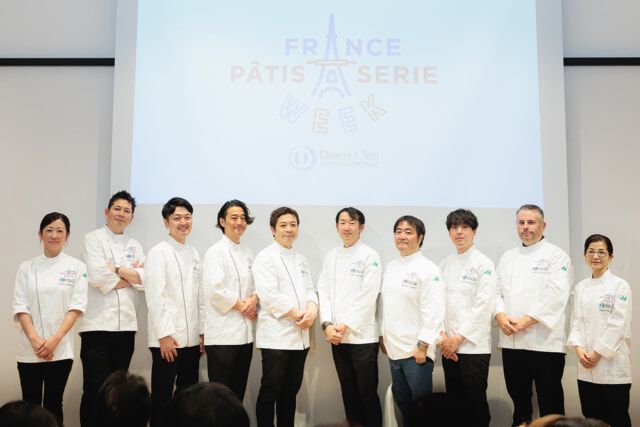 ▲記者発表会では、ダイナースクラブ フランス パティスリーウィークに参加する10人のシェフが登壇