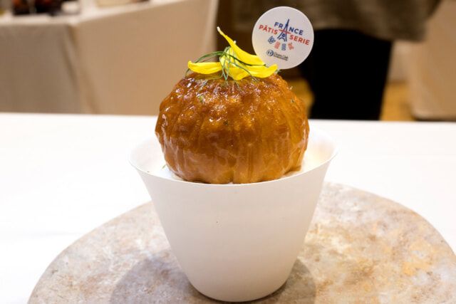 フランスと日本のいいものを使ったサヴァランを作り上げた Galet Galet(ガレ ガレ)は、催事場で活躍する無店舗のパティスリー。日本の伝統でもある菊の花の形をしたサヴァラン生地に、フランスの香草のリキュール「シャルトリューズ」をシロップに使い、ミントのクレームディプロマットとオレンジ、ノホイのバニラを使い、下には福井県の「黄金の梅」とフランスのミラべル(黄色すもも)を合わせたコンフィチュールを忍ばせて、柑橘や香草の香りを楽しめる、創造性豊かな一品です。