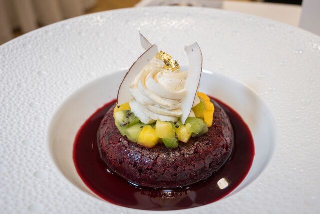石垣島のパイナップル「クガニ(黄金)パイン」を使ったフルーティなサヴァランです。下からココナッツのクレームディプロマット、パインのコンフィチュール、そして生姜とバニラでクガニパインを茹でた煮汁にサヴァラン生地を浸し、上にはミント、ライム、ホワイトラムでさっぱりさせたジュレを乗せ、オレンジのクリームをトッピング。食べながらスポイトに入ったネグリタのホワイトラムを振りかけると味変も楽しめます。