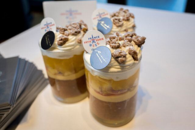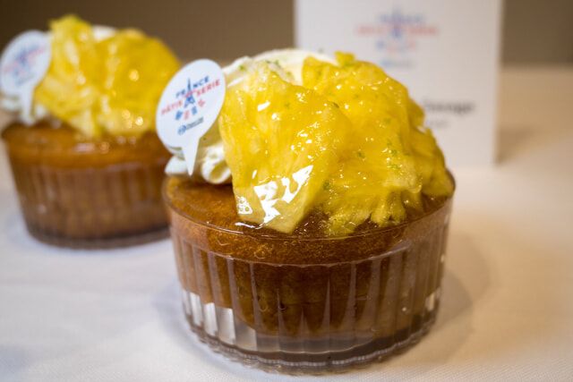 お店では2種類のサヴァランを販売する予定で、今回お披露目されたのはダイナースクラブ フランス パティスリーウィーク前半に登場する商品です。サヴァラン生地にはネグリタラムとパッションフルーツのリキュールをブレンドしたシロップを染み込ませ、ミニグラスには、クレームディプロマット、生姜の香りをつけたフランボワーズのコンフィチュール、コンポートしたパイナップル、エキゾチックフルーツのジュレ、クレームシャンティーを重ね、ザクザクのシュトロイゼル・ショコラオレとライム果皮で飾りました。