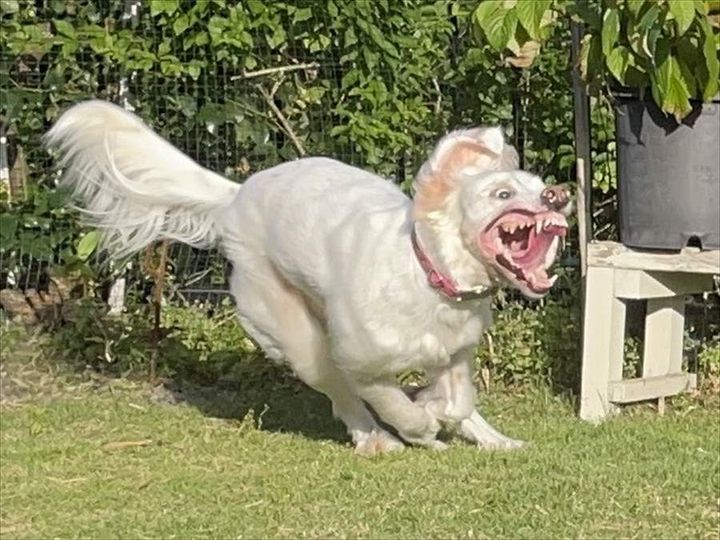 目を大きく見開き、口を開けたまま走っている麦ちゃん。 その速さや勢いもあってか、大きく開いた口元がめくれてが全部見えてしまっています! 何かを捕食しようとしている、そんな勢いを感じる形相になっていますね。