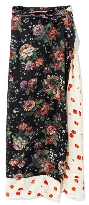 シックな花柄と白地に小さな赤いバラをプリントした生地をつなぎ合わせた、可憐なムードを纏ったラップスカート。キュプラ素材で、着心地は軽やか。¥41,800(カレンテージ/メルローズ TEL:03・3464・3310)
