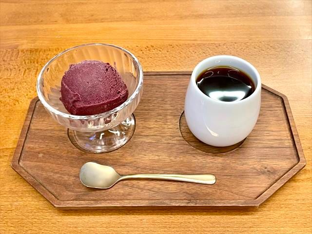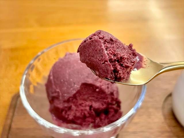 そしてアイスが絶品! ブルーベリー本来の柔らかな果実味がいっぱいに広がり、自然で優しい甘さ。後味は少しの酸味でさっぱりします。少しジェラート感のあるシャリっとした口当たりながら、口溶けはまろやかなのも独特です。