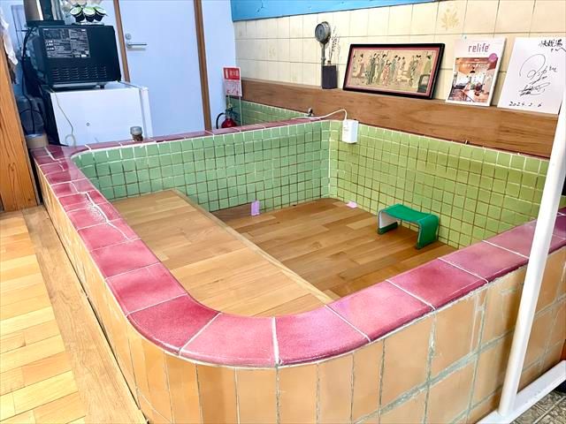 ペンキ画の下には、カラフルなタイル張りの浴槽も。中に入って富士山を仰ぎ見れば、まさに当時そのままのお風呂気分ですね。