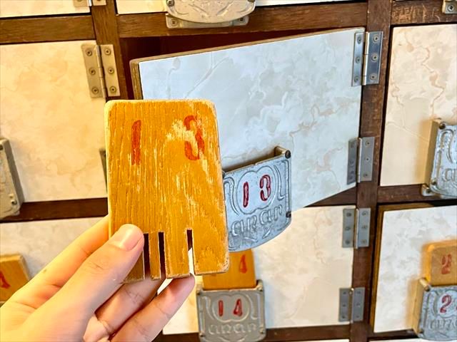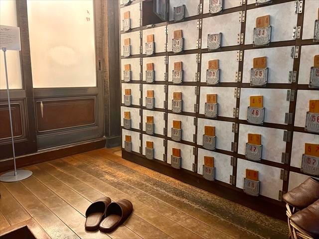 履物をしまうのは、鍵が木札の下駄箱。年季を感じます。そして向かって右側、かつての女湯の扉を開けて店内へ。