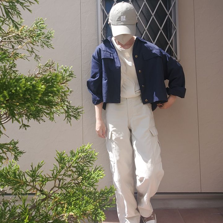 ワーク感が強めアイテムなのでカーディガンやシャツ・ブラウスなどきれいめトップスを合わせると着こなせることを発見!