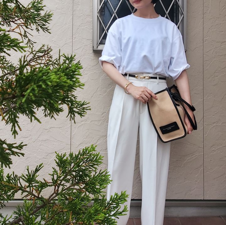 出典:MORE≪オバーサイズTシャツ×タックワイドパンツ≫ 5分袖を2回ほどまくってあげるとTシャツのカジュアル感が抜ける気がする。 オールホワイトコーデに小物でブラック色足して締まりを。
