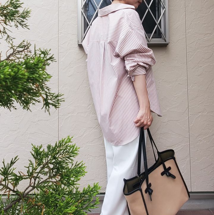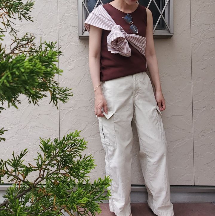 出典:MORE≪カーゴパンツ×タンクトップ×オーバーサイズシャツ≫ オーバーサイズシャツのストライプ柄ベージュ色と色味を合わせたトップスにしてまとまりよくしてみた。