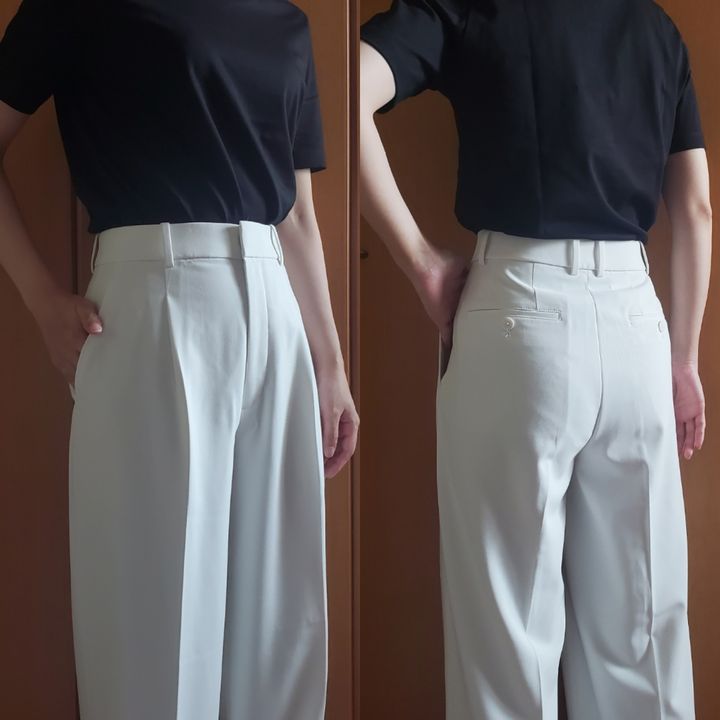 タックが入って腰・太ももにゆとりある、ストンと落ち感あるワイドパンツなのでそこまで気にしなくていいシルエット。