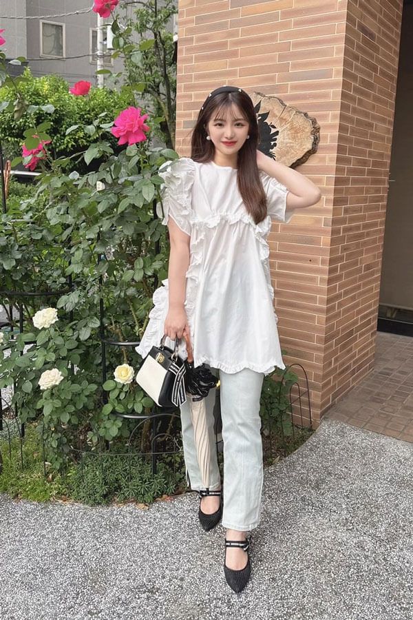 トップスは丈感や袖丈の絶妙なバランスで細見えするCOCO DEALのフリルチュニック♡ おしりもすっぽり隠れる丈なので、気になる太ももやおしりを隠してデニムを楽しみたい方におすすめです!