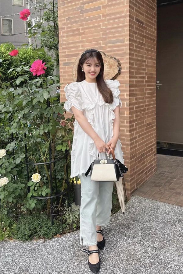 そして、空色の爽やかなカラーで裾にスリットが入ったストラのきれいめデニム! デニム苦手民でも挑戦しやすく、カジュアルになりにくいので夏におすすめです♡