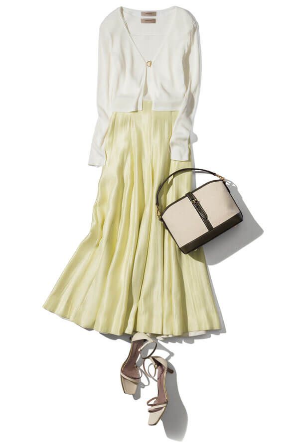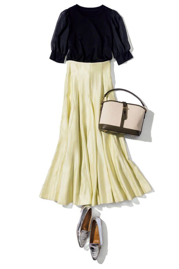 ポップにも見えがちなイエローを、シャイニーな光沢で上品に振ったスカートが主役。シアーな白のアンサンブルを合わせると温度感が下がり、涼やかでエレガントな風情です。