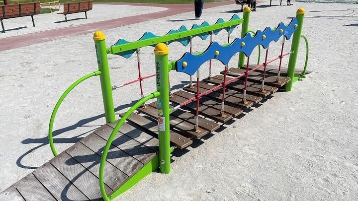 つり橋型遊具。中央のステップ部分は車いすでも通行できる設計になっています。