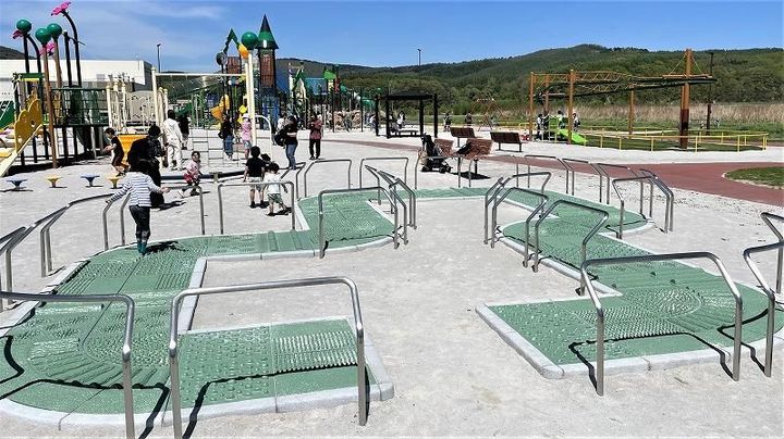 これは、札幌にある「農試公園」の回でもご紹介した、近年注目される、誰もが楽しめる “インクルーシブ(=すべてを包み込む)遊具” で、利用者への思いやりを感じます。