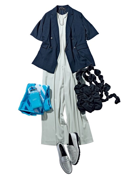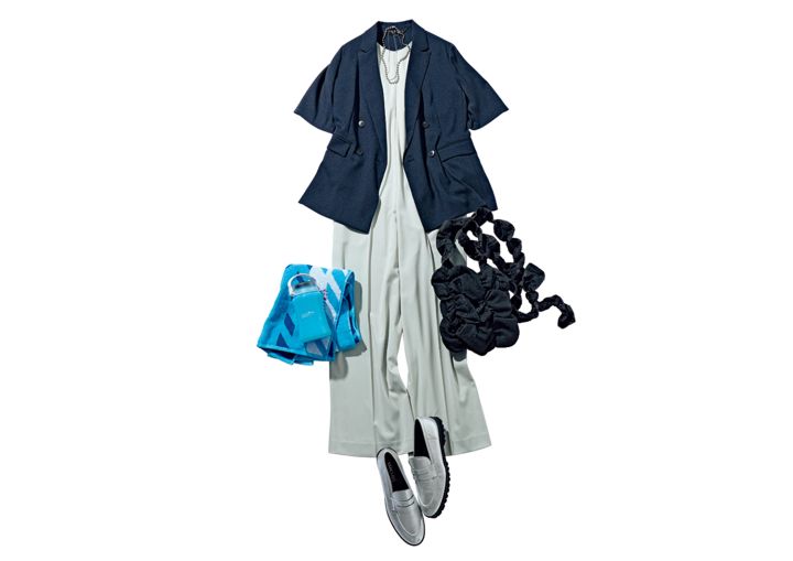 ジャケット¥18,920/インディヴィ(ワールド) Tシャツ×オールインワンSET(オールインワン)¥16,940/ミラ オーウェン ルミネ新宿2店 ギャザーショルダーバッグ¥5,940/キャセリーニ ローファー¥39,600/ブランベール(ウールン商会) ネックレス¥2,800/ミーティア(ロードス)