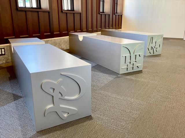 購入したフード・ドリンクは、2階のフォトジェニックな"活字ベンチ"や……