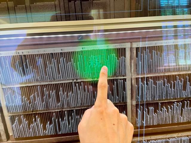 こちらは大量の活字が収納された棚(ウマ)から、原稿にあわせた活字を1つ1つ拾う「文選」の作業を、タッチパネルを通して疑似体験できるブースになっています。