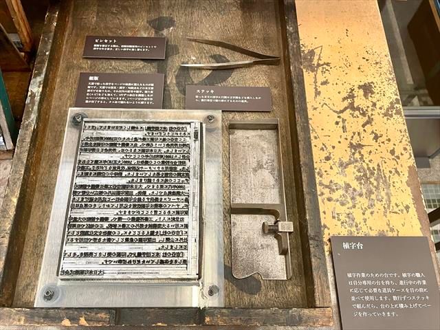 展示されている道具や活字は、実際に使用されていたものばかり。ディスプレイに使われる棚や台に至るまで工場のものが再利用されているので、レトロ好きにはたまりません。