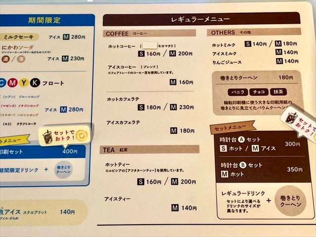 こちらがメニューですが、ホットコーヒーのMサイズで200円、アイスティ―はMサイズで140円など、お値段が非常にお手軽です! また、夏季限定として印刷をテーマにしたオリジナルドリンクも販売中。