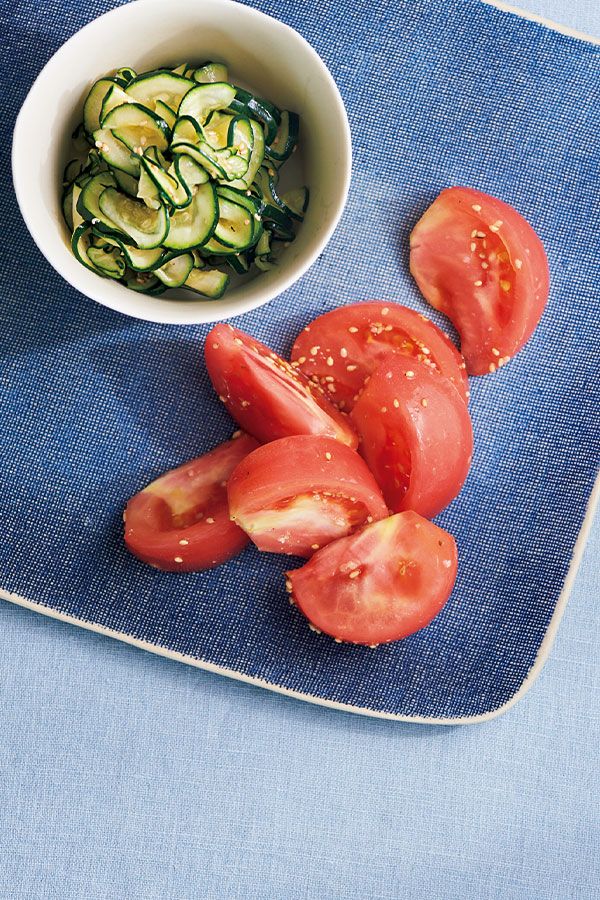 塩トマトや生のズッキーニなど、いつもの食材をちょっとした変化球で。韓国料理定番のナムルがいつもより新鮮に感じられるはず。